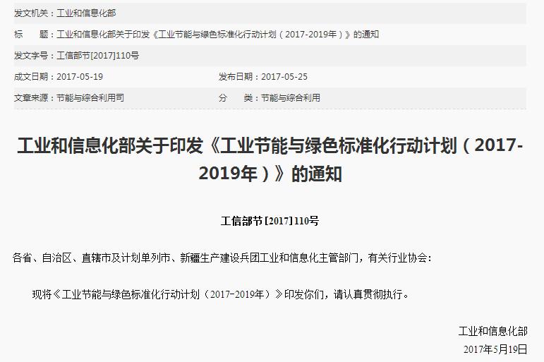 關(guān)于工信部印發(fā)《工業(yè)節(jié)能與綠色標準化行動計劃(2017-2019年)》的通知